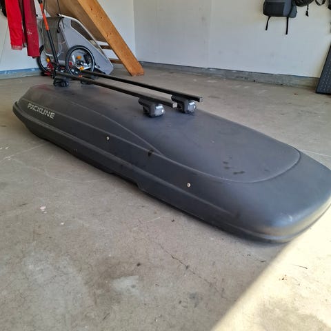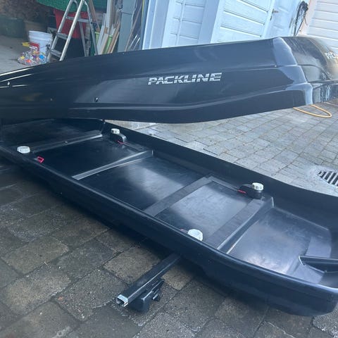 Packline takboks i svart utførelse. Lengde ca 220cm. Takboksen monteres på takstativ og åpnes fra enden. Innvendig er det festepunkter og reimer for sikring av bagasje. Egner seg til transport av bagasje, ski og annet utstyr på bilturer.