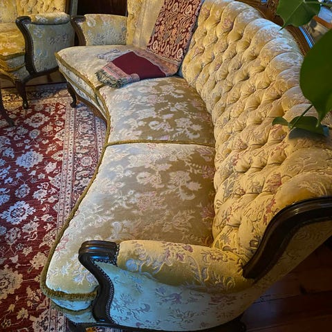 Møblene er brukte og har noe slitasje på stoffet (se bilder), men fremstår som solide og godt vedlikeholdt. Perfekt prosjekt for omtrekking eller bruk som de er for riktig stil.