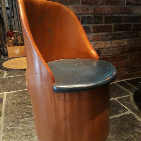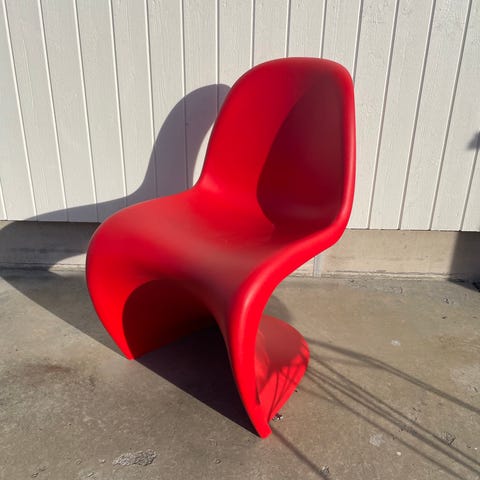 Dette er en plast lounge stol fra det italienske merket Driade og designeren Ron Arod. Stolen har en ytre overflate i rosa og innside i mørk grå. Utført i rotasjonsstøpt hardplast som egner seg både inne og ute, Åpen konstruksjon i front og bak gir et skulpturelt uttrykk og gjør den enkel å rengjøre. Passer som sittemøbel i hage, på terrasse, uteplass eller i uformelle innemiljøer der man ønsker en lav lounge-stol med fast sete. Jeg har brukt den ute som et kult møbel å slappe av i. Den har tydelige bruksmerker etter gynging og bruk.