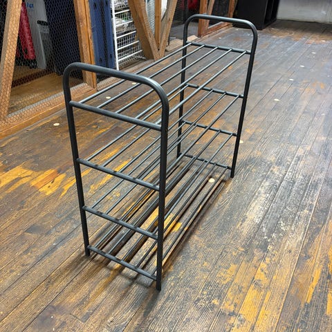 Svart skoreol i stål med 4 hyller, selges demontert. Alle skruene følger med.