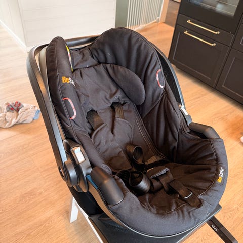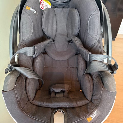 BeSafe iZi Twist i-Size barnesete for barn opptil ca. 18 kg. Barnesetet monteres med Isofix og har støtteben foran. Setet er bakovervendt og kan roteres 90-grader for enklere inn- og utstigning. Det har integrert internsele, justerbar nakkestøtte og polstrede sidevinger. Trekket er i grå tekstil med ekstra innlegg for små barn. På bildene vises slitasje på en av tekstilstroppene ved skulderområdet. Setet er beregnet for bruk i bil med Isofix-fester og passer for småbarn innenfor godkjent vekt- og høydeområde for i-Size-serien.