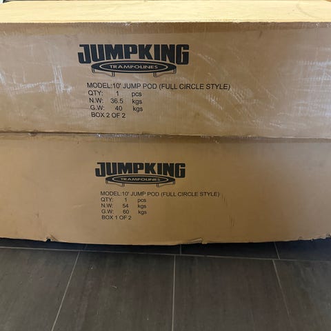 Trampolina er ca 10 år, duk med nett og polstring er ca 4 år.