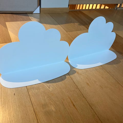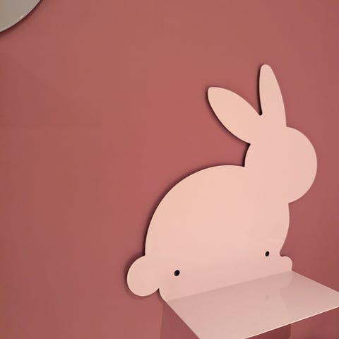 Vegghylle formet som en kanin til barnerom. Lys rosa hylle med enkel, stilisert kaninprofil og rett hylleplate. Monteres på vegg gjennom forborede hull. Egnet til lett oppbevaring eller dekor på barnerommet. Noen små merker. Se hylla på høyre side. Ubetydelig, men greit å si i fra