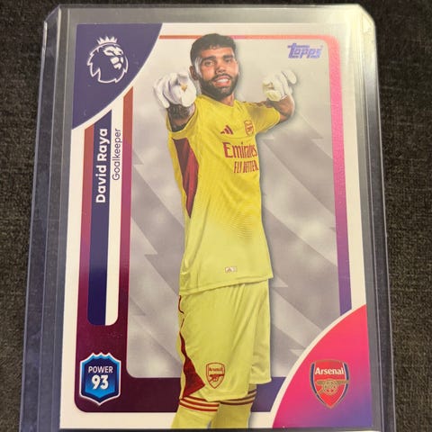 Topps Premier League Bruno Fernandes Manchester United samlekort. Kortet viser Bruno Fernandes i Manchester United-drakt på forsiden, med spillerinformasjon og tekst på baksiden. Kortet er merket med sesong 2025/26 og har klubbens logo samt Premier League-logo.