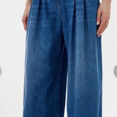 Ganni bukse i lyseblått tøystoff med hvite striper. Utrolig myk og deilig i stoffet. Str. 27.