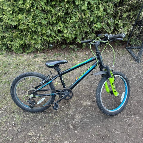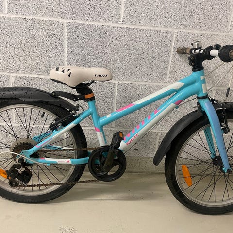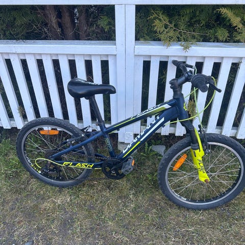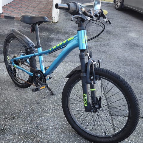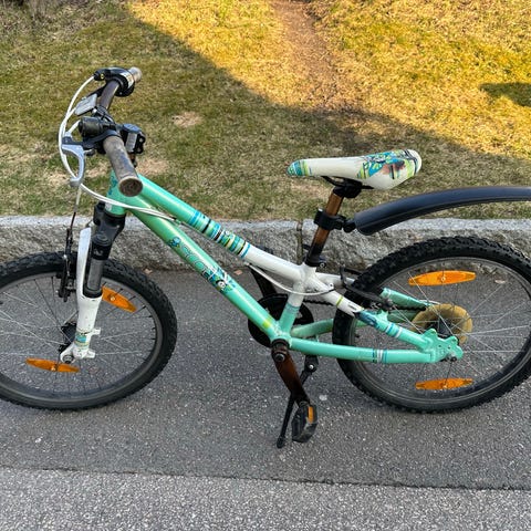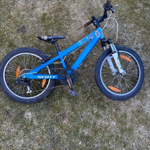 Scott barnesykkel 20" med blå ramme. Sykkelen har dempegaffel foran, V-bremser og gir bak. Utstyrt med skjermer foran, støtte og komfortabelt sete tilpasset barn.