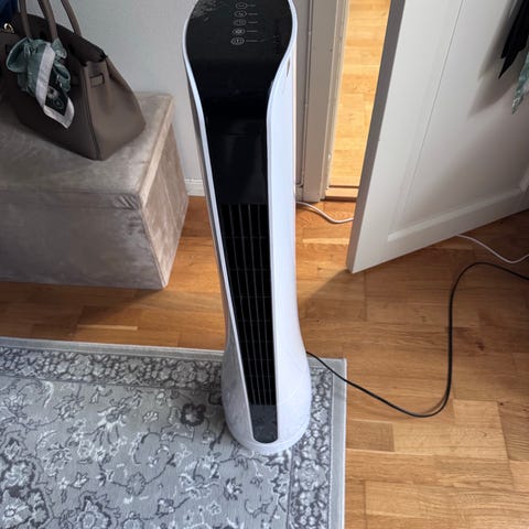 Tårnvifte i svart farge. Viften har kontrollpanel på toppen med knapp for av/på og flere innstillinger for viftehastighet og funksjon. Følger også med fjernkontroll, kjøpt våren i fjor.