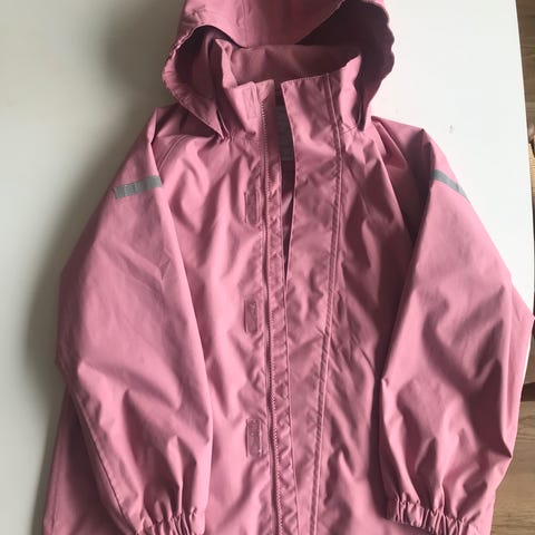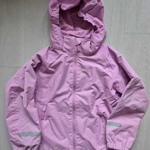 Lite brukt lys lilla regnjakke str 134-140. Refleks på ermene og ryggen. Hetten er festet med trykk knapper. Fóret rundt halsen på innsiden. Strikk rundt åpningen på ermene.