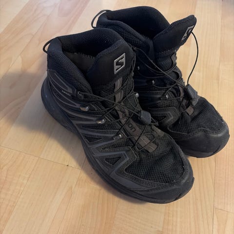 Salomon XA Pro 3D tursko i størrelse 39 1/3. Skoene er svarte med hurtigsnøring og grovmønstret yttersåle tilpasset fottur og variert terreng. Overdelen er i tekstil og syntetisk materiale med forsterkninger på utsatte områder. Sålen har markert mønster for grep på ulike underlag. Passer til fotturer og annen bruk der det er behov for stabile og lukkede sko.