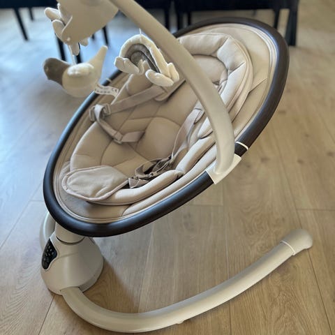 Nuna Leaf vippestol i beige tekstil. Stolen har polstret sete med avtagbar innsats og integrert sele for å holde barnet på plass. Kjøpt ny av oss og er pent brukt, ingen flekker men er vanlig bruksslitasje.