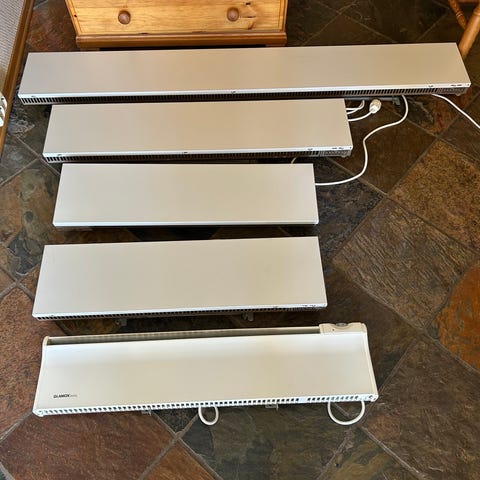 Hvite panelovner med termostat. Enkle å montere på vegg med stativ. Ikke blitt brukt siste året etter installering av varmepumpe, men funker fortsatt.