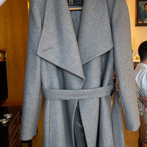 Michael Kors kåpe for dame i størrelse 6 (S). Kåpen er grå og har et åpent, drapert frontparti med tilhørende belte i livet. Lengden går ned mot låret, og den har lange ermer. Passer som ytterjakke i overgangssesonger eller milde vinterdager. Materialet fremstår som vevd stoff med myk overflate. Designet er enkelt og nøytralt, egnet til både hverdagsbruk og mer formelle anledninger.
