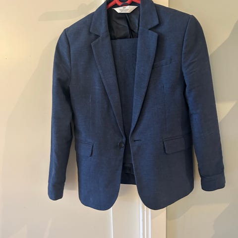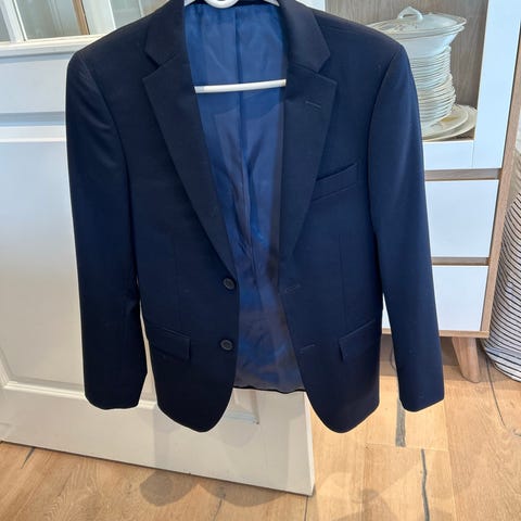 H&M blazer for barn i størrelse 158. Jakken er unisex og har en mørk blå farge. Materialet er polyester med glatt, mønstret fôr på innsiden. Klassisk modell med krage og slag, samt lukking foran. Egnet til bruk over skjorte eller genser ved formelle anledninger eller som en pen hverdagsjakke.
