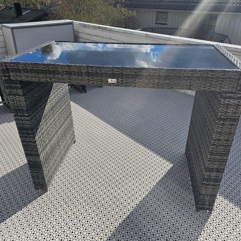Hagebord sofabord i kunstrotting med glassplate i grå farge. Bordet er kvadratisk og har en bordplate i herdet glass som ligger oppå en ramme trukket med flettet kunstrotting. Passer som lavt bord til lounge- eller sofagruppe på terrasse, balkong eller i hage. Bordet står på små ben/føtter som løfter det lett fra underlaget.