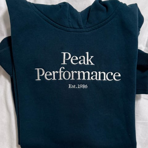 Mørkeblå Peak Performance hettegenser/ hoodie i str. 150. Genseren er pent brukt og har fortsatt veldig mye bruk igjen. Ingen hull, flekk eller mangel. Nypris ca 800,-