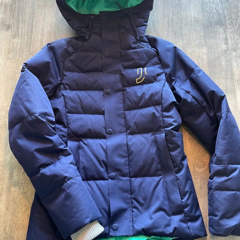 Johaug dun vinterjakke for dame i størrelse M. Jakken er blå med kontrastfarget innside. Vinterjakken har vattert dunfyll som gir god isolasjon. Den har hette, gjennomgående glidelås foran og flere sømmer som gir en figurnær passform. Yttermateriale og fôr er i syntetisk stoff, med dun- og fjærfyll i vattering. Egnet som ytterjakke på kalde dager i vinterhalvåret.