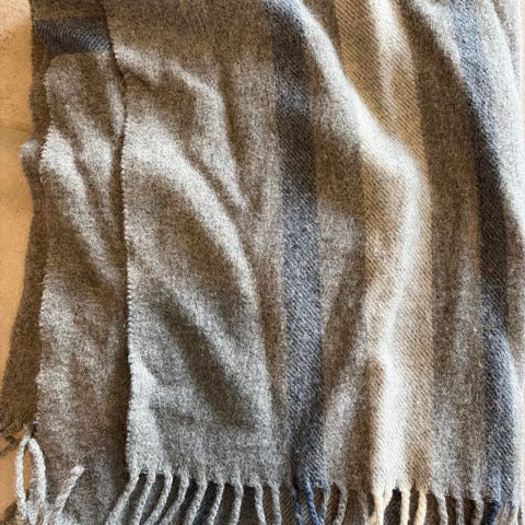 Mykt stort skjerf med nyanser i grå og mørk grønn av ca 40% ull. Lite brukt