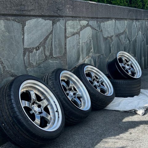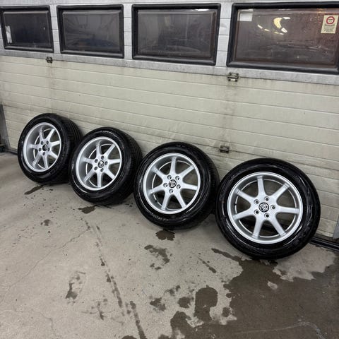 Selger et komplett felgsett med john brown rs4 felger og Dunlop dekk.