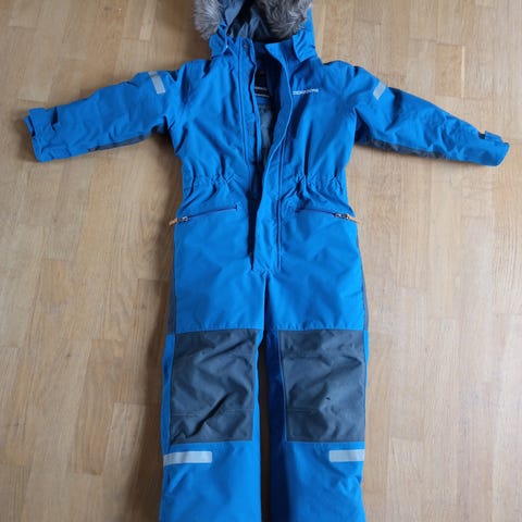 Didriksons parkdress for barn i størrelse 120. Dressen er blå med forsterkede felt på knær og sete. Ytterstoff, fôr og vattering er i polyester. Modellen er merket som 100 % vanntett med tapede sømmer (STORMsystem).
