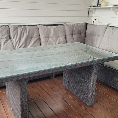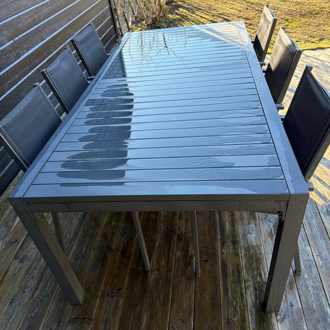 Hagebord til salgs. Bordet har innebygd lem og kan forlenges. Stoler kan følge med hvis ønskelig, stolene er i god stand. Lengde 2,24, lengde med lem 3.5 m, bredde 1 m, høyde 76 cm