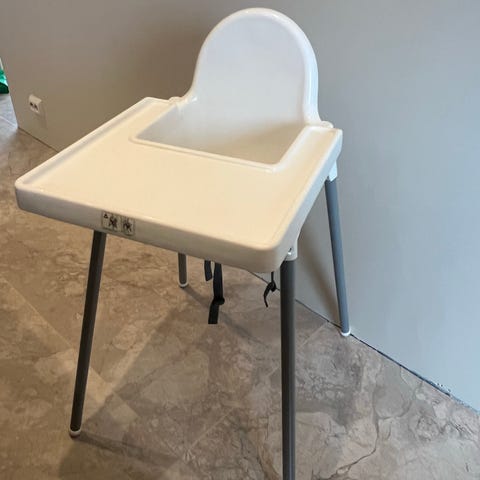 IKEA høy barnestol i hvit plast. Stolen har sete og rygg i plast med avtagbart bord og metallben. Den er utstyrt med sikkerhetsbelte i setet. Egnet som spise- og sitteplass for små barn ved bordet. Enkel, lett og praktisk å plassere ved spisebord eller på kjøkken.