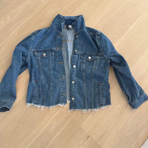H&M L.O.G.G. olajakke for dame i størrelse 38. Jakken er laget i blå denim og har klassisk olajakkesnitt med krage, knappelukking foran og brystlommer med klaff og knapp. Ermene har mansjetter med knapp. Passer som lett ytterjakke i hverdagen eller som et lag over topp eller kjole.