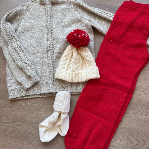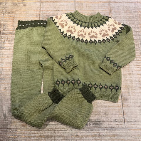 Pent hjemmestrikket ullsett med ullbukser og ullgenser i grønn med hvitt mønster. Pent brukt, ingen hull, men noen nupper. Strikk i livet på buksa. Fra røykfritt og dyrefritt hjem. Hentes i Ski eller sendes mot betaling av porto.