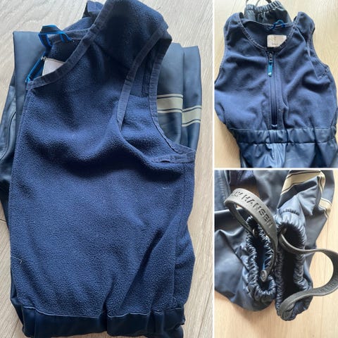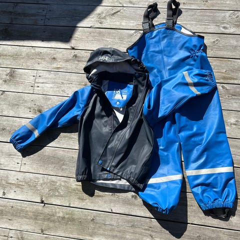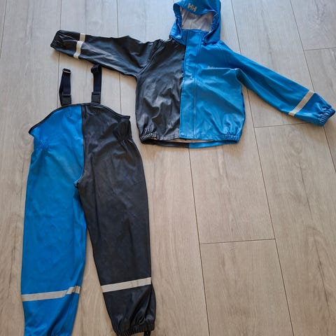 Helly Hansen regnbukse og regnjakke for barn i størrelse 116. Regntøyet er unisex og laget i polyester. Farge blå. Elastikk nederst på bena for bedre passform over støvler..