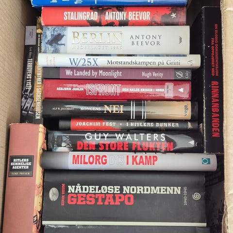 Bokpakke med bøker om krig, både afghanistan og 2 verdenskrig