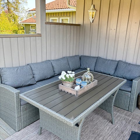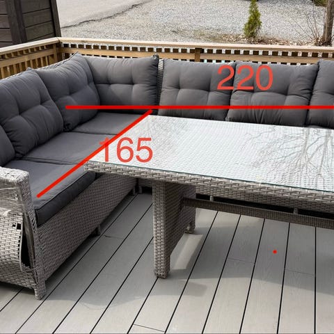 Loungemøbler selges pent brukt. Møbelsettet består av en hjørnesofa med deilige myke puter, to puffer med tilhørende puter, samt et bord med glassplate på toppen.