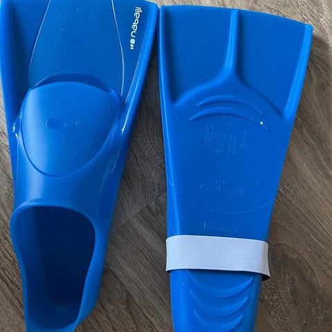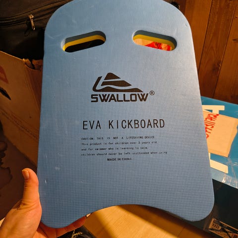 Svømmebrettet har gripehull øverst for bedre håndtering og måler omtrent 40 cm i lengden og 28 cm i bredden.