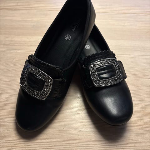 Godt brukte bunadsko med hæl i str 36 selges. Kan justeres over vristen med borrelås. Ny pris 599,-
