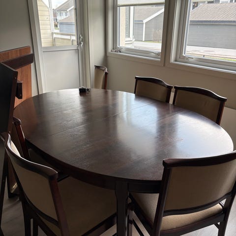 Bordet er pusset og behandlet, men er litt skjoldete. Bør sikkert gjøres på nytt.