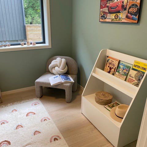 IKEA bokhylle for barn i tre. Hyllen har gjør det enkelt for barn å se og hente bøker selv. Den er laget i lyst treverk med en blå bunnplate i nederste hylle..