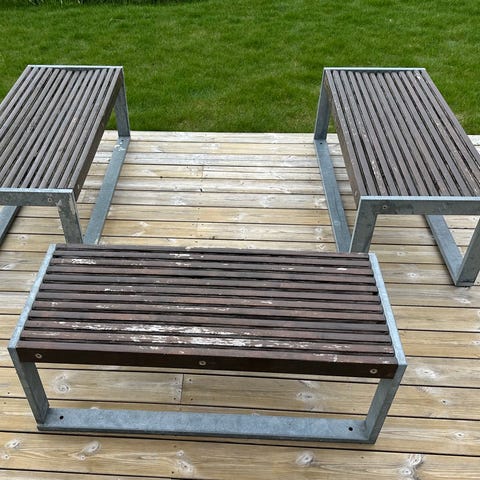Utebenk med fast bord i rustfritt stål og fin stand - transport kan ordnes