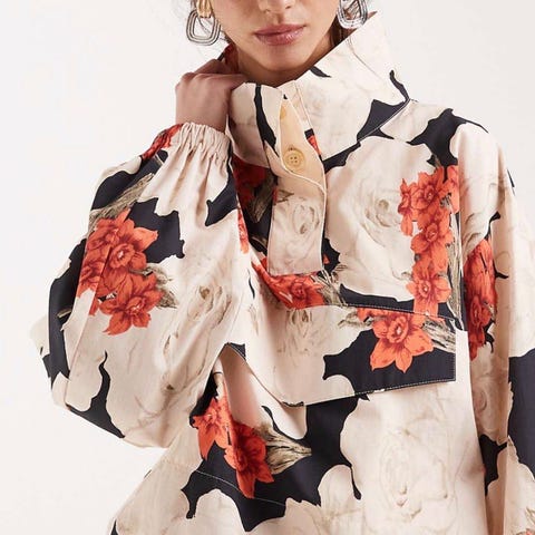 Veldig fin jakke i vevd bomull med quiltet struktur. Helt ny med lappen fortsatt på. Nypris 799,- (utsolgt på hm.no). Flerfarget blomster- og naturinspirert mønster med mørke sider og lysere parti foran og bak. Åpen front uten krage og avtagbart knytebelte i livet. Lange ermer og rett passform.