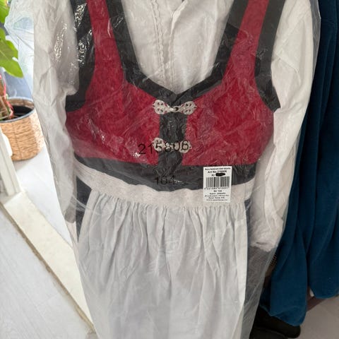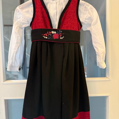 Festdrakt inkludert hvit skjorte for jente i størrelse 98/104. Kjolen er i svart bomull/polyester med røde detaljer og broderi i livet. Hvit tilhørende bomullsskjorte. Selges som et helt sett. Perfekt til festlige anledninger og 17. mai.
