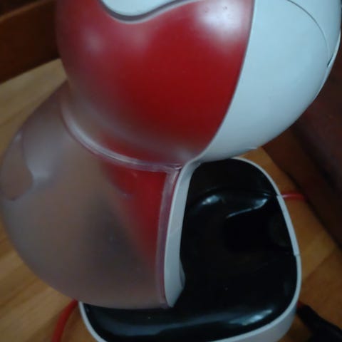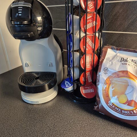 Dolce Gusto kapselmaskin i hvit farge. Maskinen er beregnet for bruk med Dolce Gusto-kapsler for tilberedning av ulike varme drikker som kaffe og andre kapselbaserte drikker.