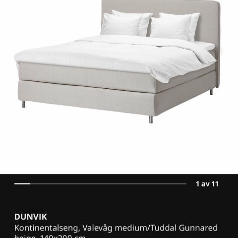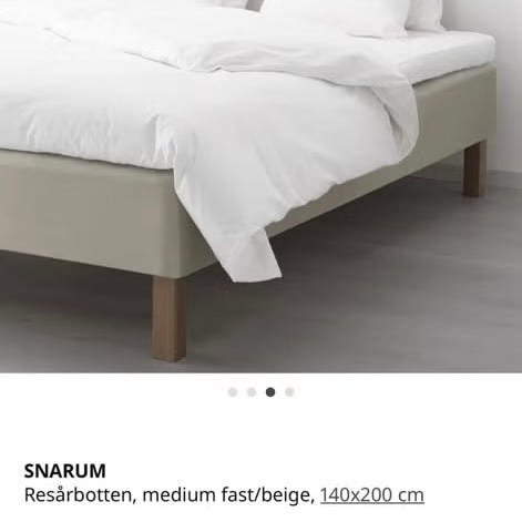IKEA SNARUM rammemadrass og TALGJE overmadrass i størrelse 140x200 cm. Kan brukes som liten dobbeltseng eller romslig enkeltseng. Rammemadrassen er pent brukt. Bein av tre. Overmadrassen er synlig brukt og har vaskbart trekk (60 grader). Hentes i Slemmestad