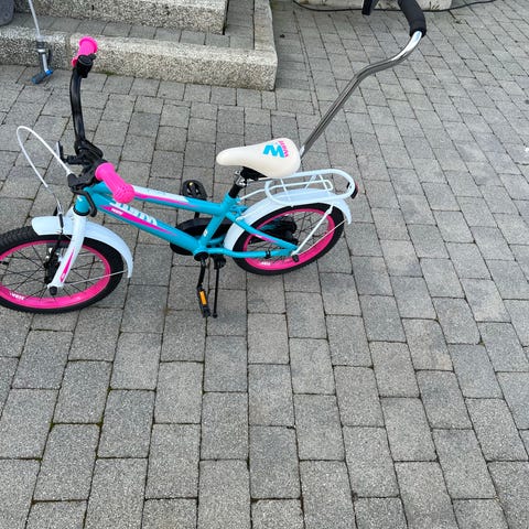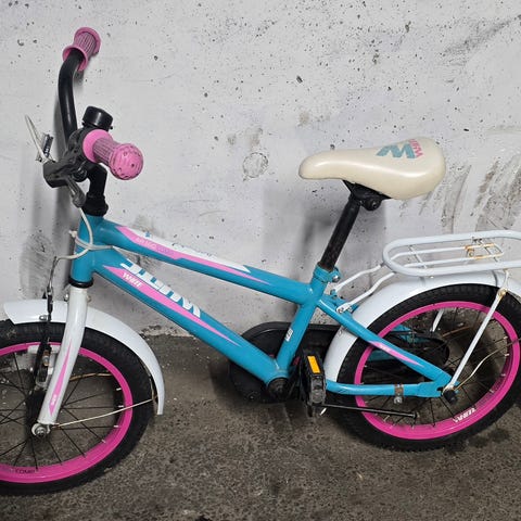 White AR 160 Comp barnesykkel med 16" hjul. Sykkelen har blå ramme med rosa og hvite detaljer. Den er utstyrt med støttehjul, bagasjebrett bak, skjermer og hvit sadel. Passer til barn som skal lære å sykle eller som trenger en mindre barnesykkel med 16-tommers hjul. Litt rust. Bremsen må strammes.