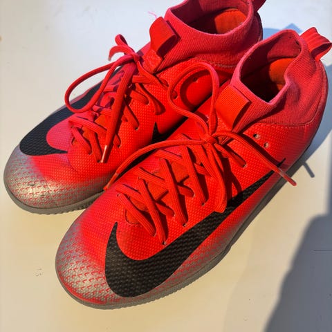 Nike Mercurial innendørs fotballsko i rødt med grå og svarte detaljer. Skoene har snøring foran og sokkelignende krage rundt ankelen for tettere passform. Yttersålen er flat med mønster tilpasset innendørs baner og gir godt grep på harde underlag. Egner seg til futsal og annen innendørs fotballaktivitet.