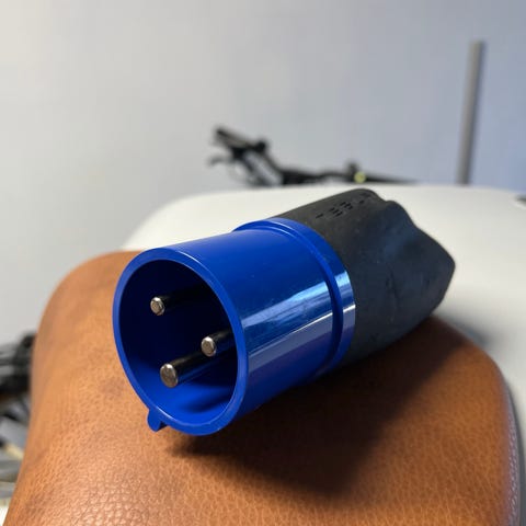 Original blå CEE-adapter for Teslas mobile ladekabel (UMC). Denne adapteren er den som typisk fulgte med Tesla Model S og gir en optimal ladehastighet fra en 32A industrikontakt.