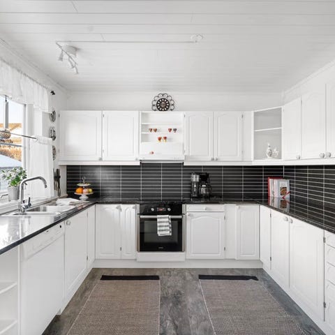 Hvit kjøkkeninnredning med rette fronter og overskap med ett glassfelt. Høyglans. Karusell i hjørnet nærmest avnildet vindu. Kjøkkenet har integrert stekeovn og platetopp, samt plass til frittstående kjøleskap. Se separat annonse for oppvaskmaskin. Benkeplaten er lys, og det er stålsprutplater over benk. Platetopp og stekeovn bærer preg av alder og kan måtte byttes ut. Vask trenger ny pakning. Funker i dag.