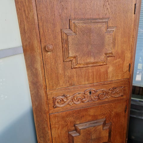 Hjørneskap i tre med overdel som har glassdør med rutemønster. Innvendig har skapet hyller som utnytter hjørneformen for lagring. Midtseksjonen har en klaff som kan felles ned, med glassfelt på oversiden og glasshylle inni. Nederst er det et skap med heldør for ekstra oppbevaring. Skapet står på lave ben og er egnet til plassering i hjørne i stue, spisestue eller tilsvarende rom.