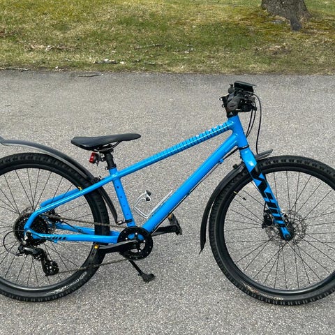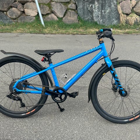 White XC 24 Lite barnesykkel med 24" hjul. Sykkelen har blå ramme og er tilpasset barn som trenger en lett terreng- og hverdagssykkel. Utstyrt med grove dekk som gir godt grep på grus og asfalt. Passer til sykling til og fra skole, fritidsbruk og enkle turer på sti og vei.