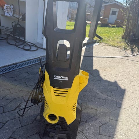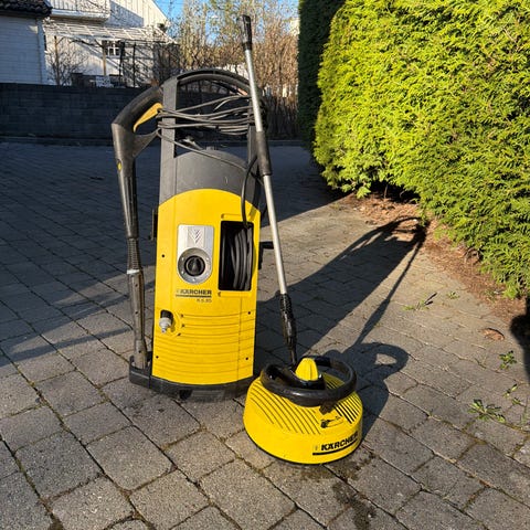 Kärcher høytrykkspyler i gul farge. Modellen har integrert håndtak og hjul for enkel flytting, samt oppbevaring for slange og kabel på enheten. Egnet for rengjøring av uteområder, kjøretøy og andre overflater som tåler høytrykksspyling. Strømdrevet modell som kobles til vannslange.