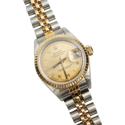 Rolex Oyster Perpetual vintage dameklokke i to-tonet stål og gull. Urkassen har rillet bezel i gull og lys gullfarget skive med strekindekser og tre visere. Lenken er i kombinasjon av stål og gull. Klokken er merket som Superlative Chronometer Officially Certified og er sveitsiskprodusert automatisk ur.