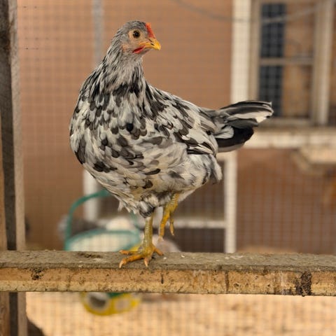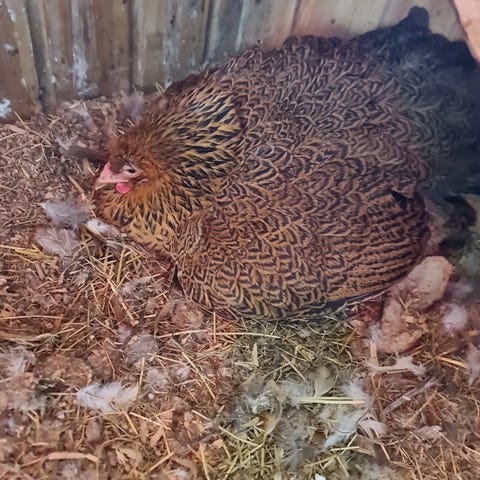 Voksen hane med flerfarget fjærdrakt. Er av rasen «islandshøns».. Staselig type, ett pr gammel. Vi har 2 haner, og det er nok en for mye.