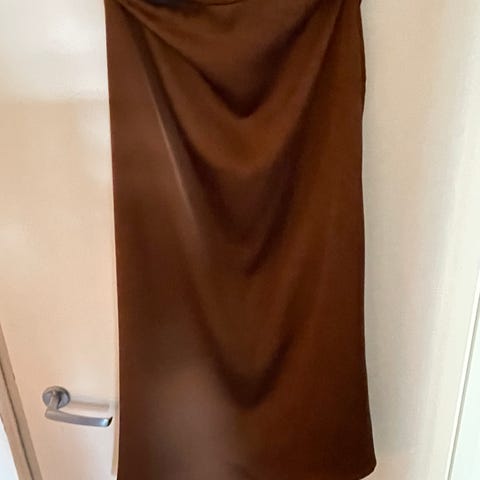 Neo Noir kjole i brun silke for dame i størrelse M. Kjolen har glatt, blankt stoff med fall som gir et mykt uttrykk. Lengden går omtrent til leggen, basert på bildene. Passer til bruk ved ulike anledninger der en enkel og stilren kjole ønskes. Materiale: silke. Farge: brun. Størrelse: M (dame).