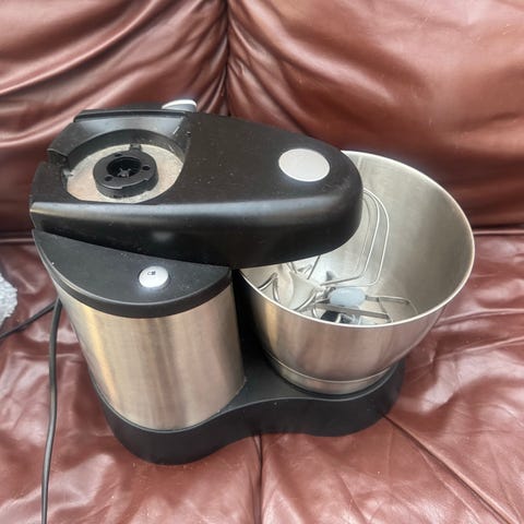 Kjøkkenmaskinen leveres med hvit miksebolle og flere visper/redskaper, blant annet ballongvisp, eltekrok og rører.